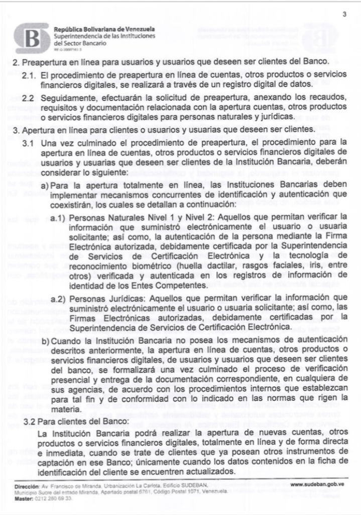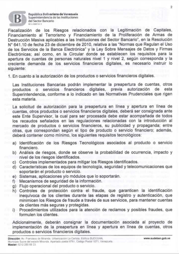 En la circular 03678, fechada el pasado 13 de junio, la Sudeban autoriza a las entidades bancarias a concretar la preapertura de cuentas y otros productos financieros en plataformas digitales, con previa autorización de la institución, la cual deberá ser solicitada con los requisitos previstos para la introducción de nuevos productos y servicios.