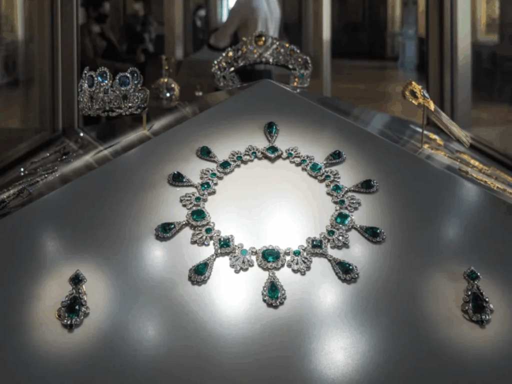 También fue robado un conjunto de collar y pendientes de esmeraldas que fue un regalo de bodas de Napoleón a su segunda esposa, María Luisa de Austria, en marzo de 1810, que contenía 32 esmeraldas finamente talladas y 1.138 diamantes.