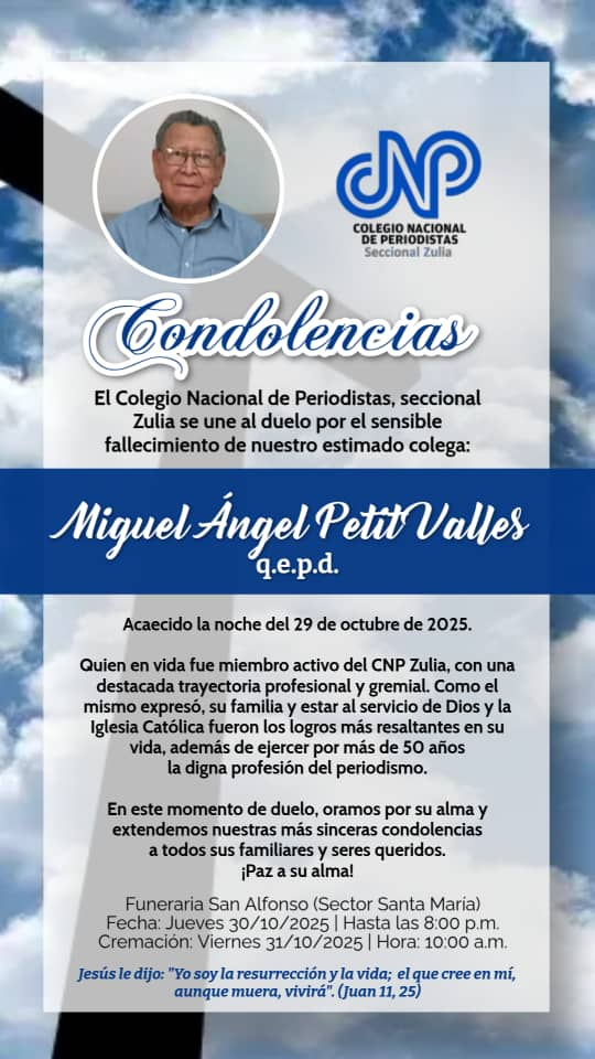El Colegio Nacional de Periodistas (CNP), seccional Zulia difundió una nota de condolencias donde se detalla que su cuerpo será velado hoy jueves en la Funeraria San Alfonso, en el sector Santa María de Maracaibo y el acto de cremación se realizará mañana viernes, 31 de octubre a las 10: a. m.