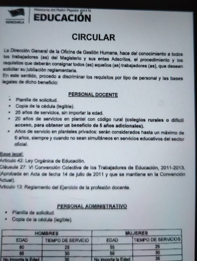 La misiva resalta que, una vez hecha la solicitud ante la Zona Educativa en el estado correspondiente, el trabajador deberá permanecer en su centro laboral hasta que reciba el beneficio por jubilación.