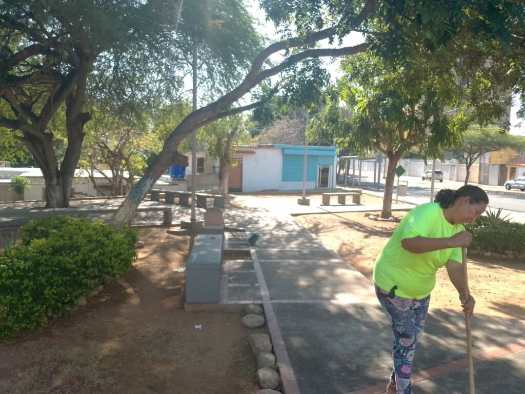 Encontramos a Angélica Bracho, escoba en mano, barriendo la plaza del General Manuel Manriquez, prócer en la Batalla Naval del Lago, donde luchó a brazo partido al lado de José Prudencio Padilla López, un valiente a quien se honra en ese espacio de la avenida Universidad.