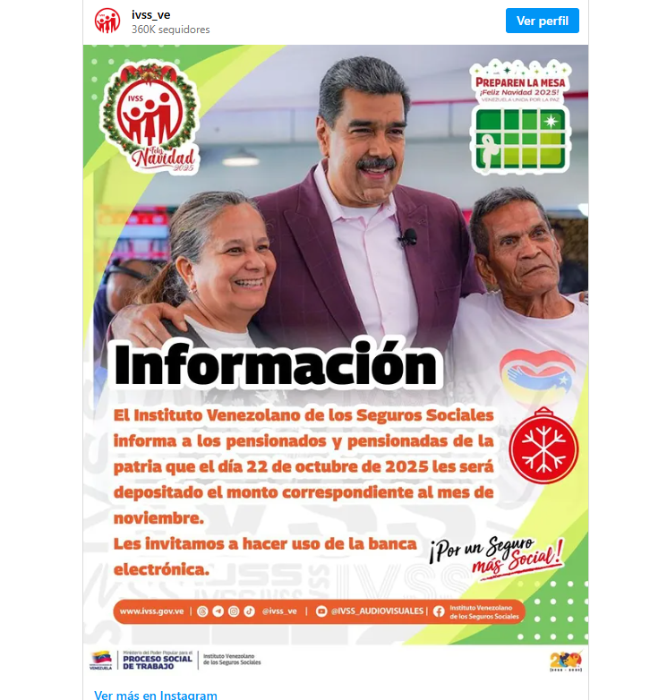 "El Instituto Venezolano de los Seguros Sociales informa a los pensionados y pensionadas de la patria que, el día 22 de octubre de 2025 les será depositado el monto correspondiente al mes de noviembre", destacó el organismo en sus redes sociales.