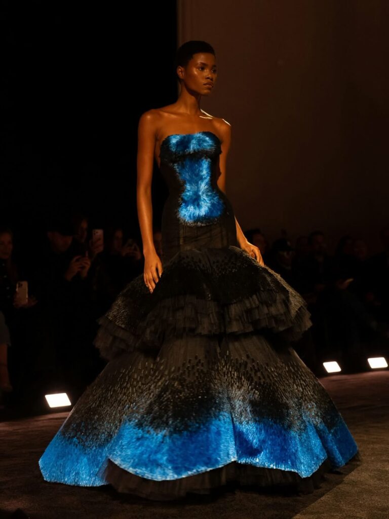 La llegada de la actriz y productora fue un espectáculo visual; ataviada con un vestido corte de sirena con escote en forma de corazón, con una terminación voluminosa y un degradado negro a rojo, este vestido de alta costura forma parte de la colección Primavera-Verano 2026 de Schiaparelli, aunque con algunas modificaciones hechas a la medida de la actriz.