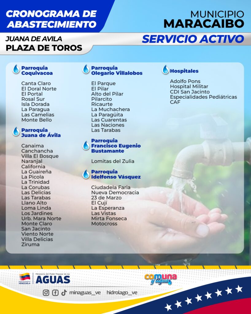 Según el anuncio oficial, el suministro está activo en sectores de las parroquias Coquivacoa, Juana de Ávila, Olegario Villalobos y Francisco Eugenio Bustamante, además de varios centros hospitalarios.