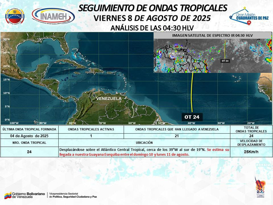 Se trata de la OT N° 24 cuya ubicación actual se halla sobre el Atlántico Central Tropical y se estima su entrada al país por la Guayana Esequiba, esto sería entre el domingo 10 y el lunes 11 de agosto.