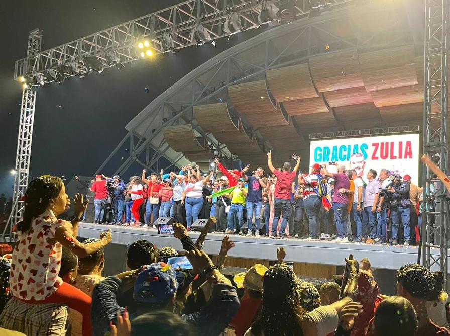 Tras los resultados anunciados por el Consejo Nacional Electoral (CNE), cerca de las doce y media de la noche de este lunes 26 de mayo, el nuevo mandatario regional se presentó en la concha acústica del AMC junto a su comitiva sorprendiendo al público que lo esperaba ansioso, ingresando a través de uno de los accesos laterales a ese recinto. Fue recibido con una gran ovación entre música y fuegos artificiales.