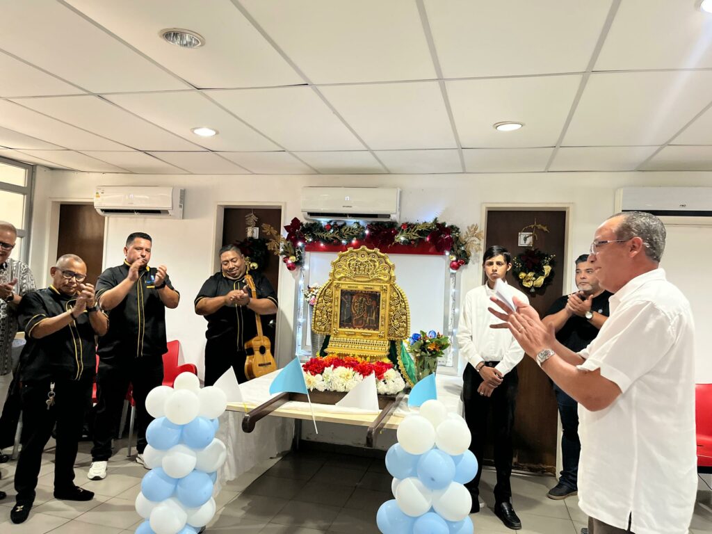Gaiteros de las agrupaciones Iluminación, Gaita y Show y de Zagales del Padre Vílchez, le rindieron tributo a la Virgen Morena con un hermoso potpurrí de canciones. El ambiente de nuestra redacción se llenó de alegría y cierta nostalgia con la inmaculada imagen, invitándonos a la reconciliación y a la unión familiar. El presbítero, Alfonso Rodríguez, párroco de la iglesia Santo Cristo de Aranza y Nuestra Señora de la Medalla Milagrosa, fue el encargado de ofrecer una breve pero sentida eucaristía.
