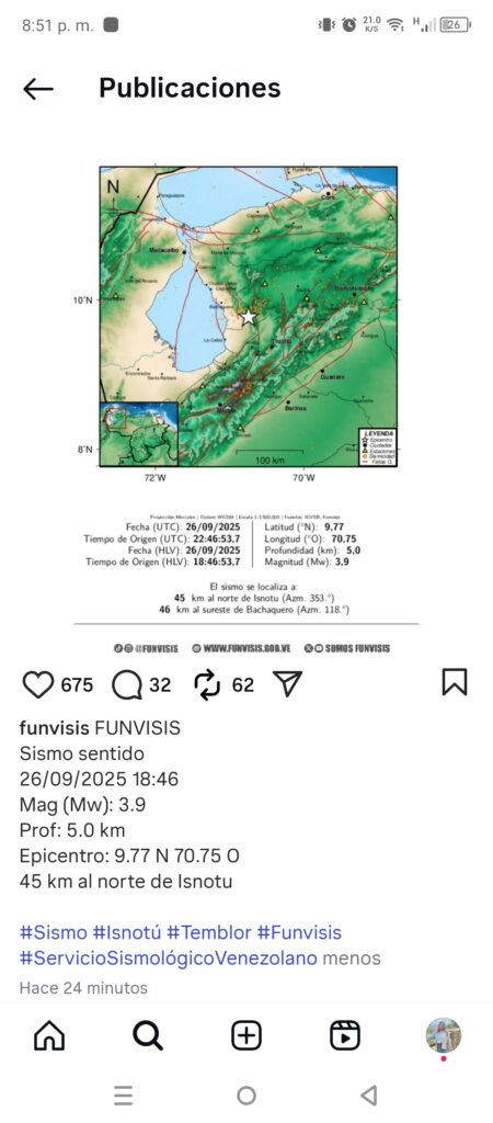 A las 6: 46 de la tarde de este viernes, 26 de septiembre la Fundación Venezolana de Investigaciones Sismológica (Funvisis), registró un nuevo sismo a 45 kilómetros de Isnotu y 46 km al sureste de Bachaquero, de magnitud 3,9.