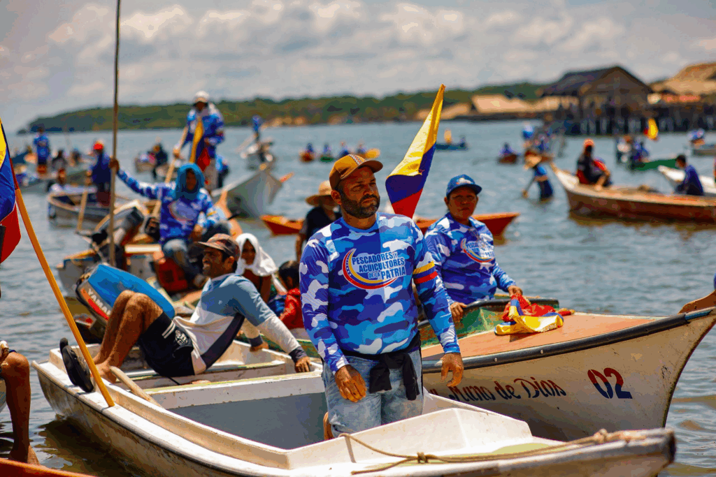El pueblo pescador del Zulia, en sus pequeñas embarcaciones de faena, escenificó una marcha lacustre en el Lago de Maracaibo junto a su gobernador Luis Caldera, la Fuerza Armada Nacional Bolivariana (FANB) acantonada en la entidad y comunas pesqueras, para elevar su voz y levantar la bandera nacional en defensa de la soberanía, la paz y el derecho de los venezolanos a existir como nación independiente.