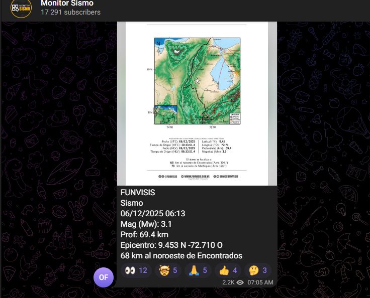 La Fundación Venezolana de Investigaciones Sismológicas (Funvisis) informó que este sábado, a las 6:13 de la mañana, se registró un sismo de magnitud 3.1 al noroeste de Encontrados, municipio Catatumbo, estado Zulia.