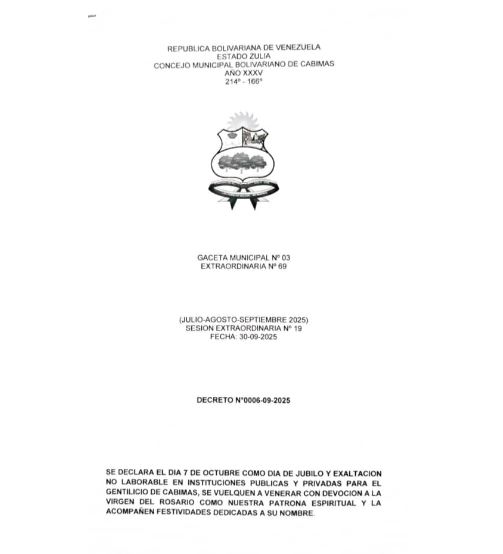 Considerando que es deber del Poder Ejecutivo Municipal dictar medidas que tiendan a exaltar los valores relacionados con la cultura del municipio Cabimas, alcalde bolivariano, Dr. Frank Carreño, bajo el Decreto Municipal N° 0006-09-2025, declara que el 7 de octubre será no laborable en instituciones públicas y privadas, por ser el día de Nuestra Señora del Rosario, patrona del municipio Cabimas.