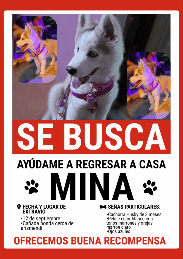Se trata de una perrita de raza Husky Siberiano, de color blanco y marrón con unos hermosos ojos azules y es propiedad de una pequeña niña que hoy sufre la ausencia de su perrita.