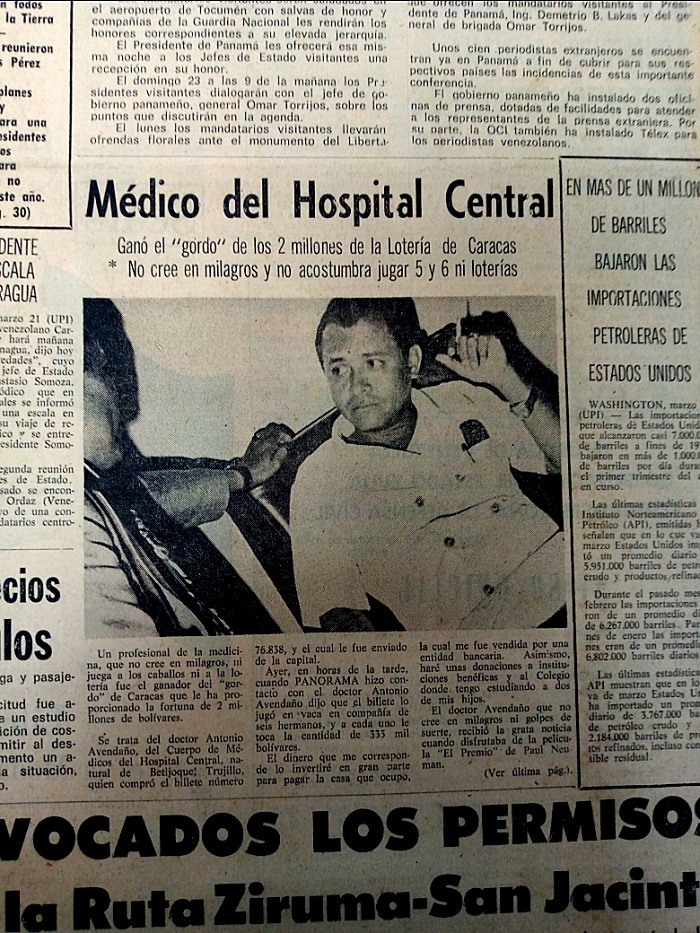 El periodista Argenis Bravo escribió para Panorama esta entrevista al Dr. Antonio Avendaño, médico del Hospital Central, quien se ganó el premio Extra de San José en la Lotería de Caracas con la fuerte cantidad de dos millones de bolívares.