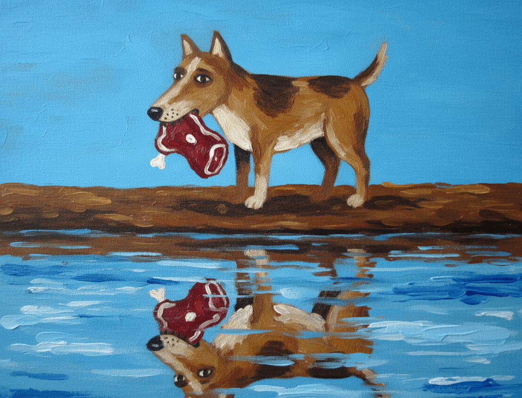 Vadeaba un perro un río llevando en su hocico un pedazo de carne. Vio su propio reflejo en el agua del río y creyó que aquel reflejo era en realidad otro perro que llevaba un trozo de carne mayor que el suyo.