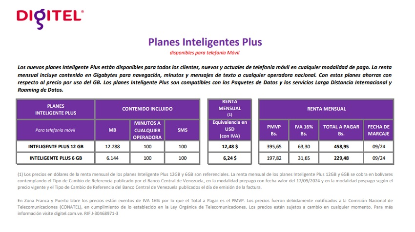 Igualmente, el plan Inteligente Plus 12GB de Digitel tiene un costo de Bs. 458,95 o US$ 12,48. Cuenta con 12.288 megabytes, 100 minutos a cualquier operadora y 100 mensajes de texto.