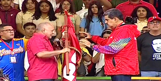 "Aprobado por aclamación de la mayoría, presidente Nicolás Maduro aquí está su partido. Ahora nos corresponde inscribirlo ante el CNE, nosotros sí tenemos candidato, Nicolás sí va", recalcó Cabello, quien entregó el estandarte del partido de Gobierno al presidente Maduro.