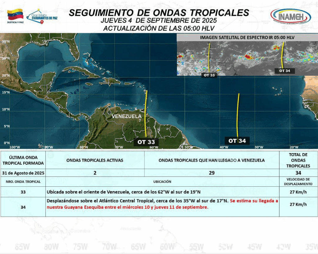 La mañana de este jueves, 4 de septiembre el Instituto Nacional de Meteorología e Hidrología (Inameh) anunció la entrada de la onda tropical (OT) número 33 al territorio venezolano, lo que probablemente traerá lluvias al Zulia y otros estados del país.