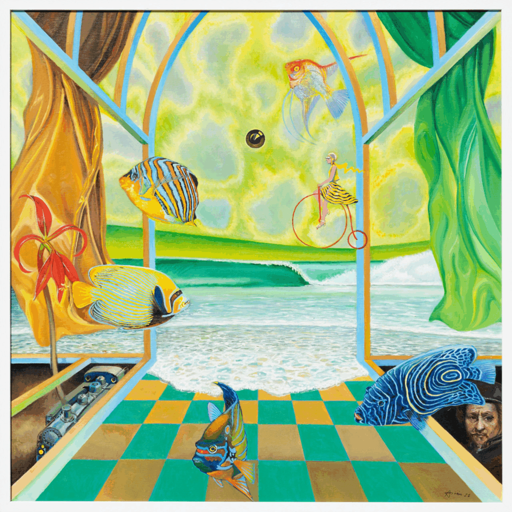 Hasta el 25 de agosto estará dispuesto un precioso conjunto de once obras de mediano y gran formato, donde el maestro pintor vuelve a sorprender con una pintura plena de exhuberantes matices tropicales, mezclada con una aguda visión inspirada en su discurso plástico, donde convergen vestigios surrealistas instigados con una muy contemporánea indagación inspirada en sus lecturas sobre la física cuántica y sus vastos enigmas.