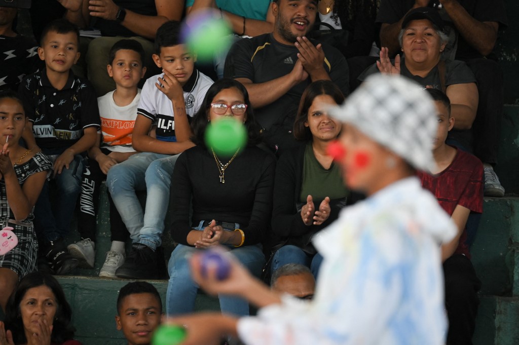 -Los niños se carcajean con las muecas, caídas y tropezones de los payasos: es el primer número de una tarde de circo en la cancha de una escuela en un barrio de Caracas, donde estos espectáculos son una excepción.