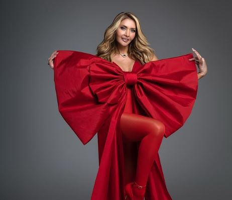 Radiante y majestuosa, luciendo un provocativo vestido rojo, fuego pasión, inspirando como siempre sensualidad, luce sus atributos de seductora, figura en una sesión de fotos con un lazo grande rojo como el mejor regalo de fin de año.