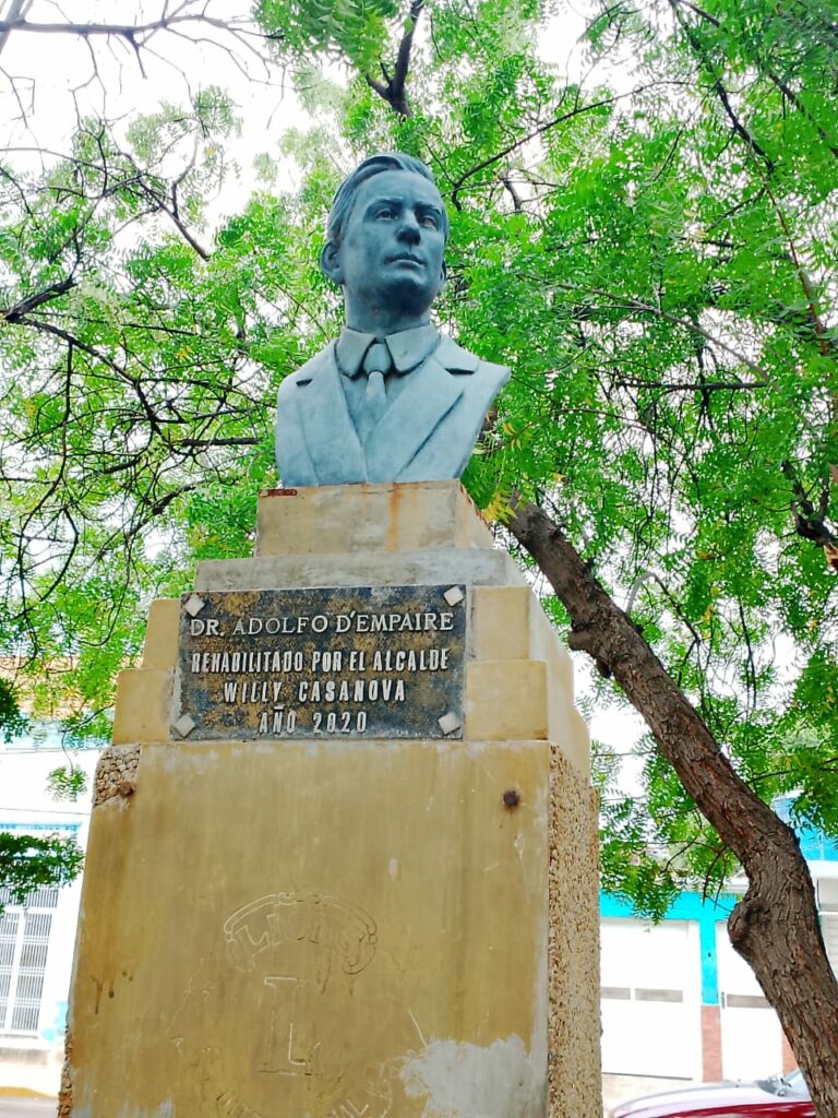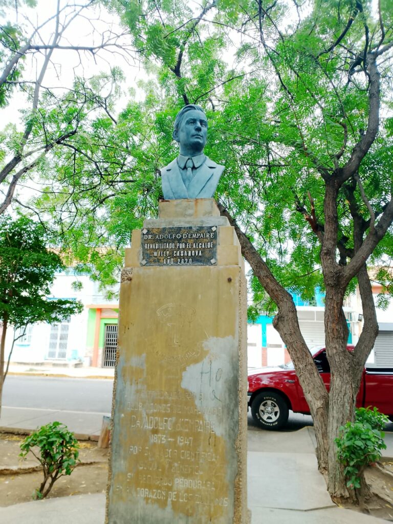 Estas dos grandes figuras son: Adolfo D´ Empaire y Eurípedes Romero. El primero honrado en bronce sobre un pedestal dirige la mirada a su gran obra el Hospital de Niños de Maracaibo y, el segundo, surge en relieve en una placa donde su imagen cuatro en la mano, sonrisa iluminada de sol zuliano, tiene de guardianes árboles que le hacen sombra.