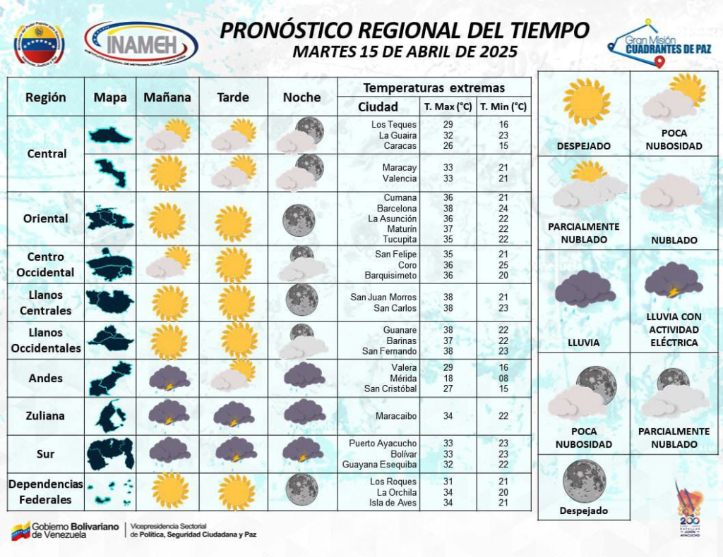 Este martes, 15 de abril el Instituto Nacional de Meteorología e Hidrología (Inameh) pronostica un calor ‘abrasador’ en gran parte del territorio, resaltando que la inclinación solar sobre Venezuela es bastante significativa, lo que incide en varios estados de oriente, centro y occidente, con mayor presencia en Zulia y Falcón.